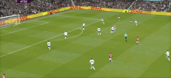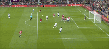 第43分钟,曼联反击,B费左路内切,禁区外右脚远射打偏。