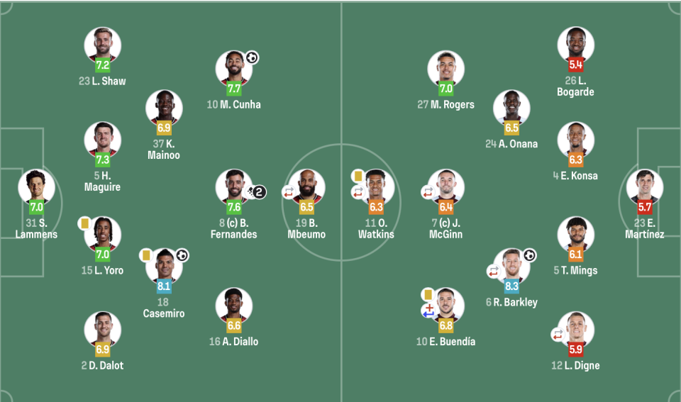 维拉(4231):23-马丁内斯;26-博加德,4-孔萨,5-明斯,12-迪涅;6-巴克利,24-奥纳纳;7-麦金(61’31-拜利),27-罗杰斯,10-布恩迪亚;11-沃特金斯(61’18-亚伯拉罕)